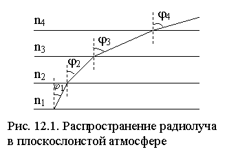 Пусть радиоволна распространяется в плоскослоистой атмосфере (рис. 12.1). Согласно закону преломления