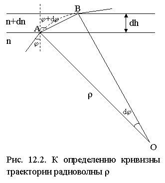 Найдём радиус кривизны радиолуча в атмосфере. Пусть плоская волна, распространяясь в слое с коэффициентом преломления n под углом j, падает на слой толщиной dh с коэффициентом преломления n + dn (рис. 12.2). Проходя такой слой, она преломится и выйдет из него под углом j + dj. На участке AB траекторию волны можно представить отрезком кривой с радиусом r. Угол между касательными к кривой в точках A и B, а следовательно, и ÐAOB, равен dj. Радиус кривизны траектории