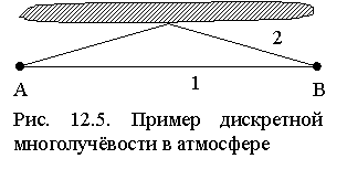 Многолучёвость бывает дискретной и диффузной. Пример дискретной многолучёвости. Пусть в тропосфере на высоте h сформировался инверсионный слой - область резкого изменения n с высотой, от которого может отразиться радиолуч (рис. 12.5). Тогда в точку приема В, помимо прямого луча 1, попадает и луч 2, отразившийся от инверсионного слоя. Если луч 1 создает в точке В поле