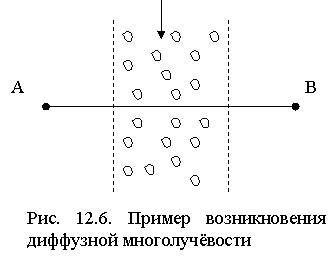 Пример диффузной многолучёвости. Пусть случайные неоднородности коэффициента преломления n перемещаются ветром поперек трассы (рис. 12.6). В результате, на пути АВ радиоволны оказываются все новые и новые неоднородности n различной конфигурации. Поскольку в тропосфере величина случайных флуктуаций Dn » (1 ¸ 2)10-6, на амплитуду принимаемого сигнала они существенно не влияют, однако может заметно изменяться фаза сигнала