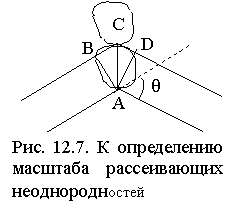 Рассмотрим наземную радиотрассу и выясним условия, наиболее благоприятные для приема рассеянного сигнала. Пусть AC = l - расстояние между рассеивающими неоднородностями по вертикали (рис. 12.7). В точке приема волны от вторичных источников А и С интерферируют, максимум сигнала получится при совпадении этих волн по фазе, для чего разность хода лучей