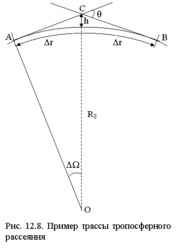 Пример трассы тропосферного рассеяния (рис. 12.8). Пусть передающая (A) и приёмная (B) антенны направлены на горизонт, и высота пересечения главных максимумов диаграмм направленности над серединой трассы h = 5 км. Найдём угол рассеяния q, полагая RЗ = 6378 км. Из DOAC имеем
