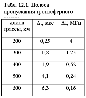 . Примерные значения полосы пропускания для различных тропосферных трасс при условии AB » 3h0 приведены в табл. 12.1.