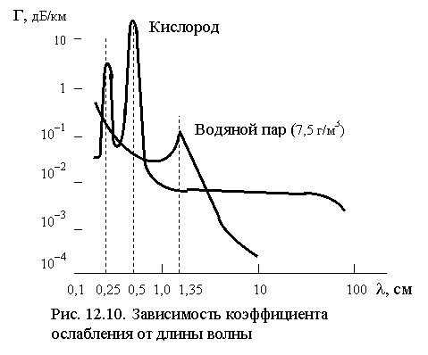 от длины волны для O2 и паров H2O. У кислорода в радиодиапазоне имеются две резонансные линии: при l = 0,5 см Г = 14 дБ / км и при l = 0,25 см Г = 3,5 дБ / км. У водяного пара резонансное поглощение имеет место при l = 1,35 см. Зависимость поглощения от удельной влажности линейна: чем выше влажность, тем выше поглощение.