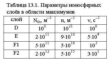 Частота столкновений электрона n = nen + nei (nen, nei – частоты столкновений с нейтральными частицами и с ионами соответственно). Для ионосферы характерны параметры, приведенные в табл. 13.1. Отметим, что концентрации нейтральных и заряженных частиц сравниваются на высотах 800 – 1000 км. Ниже 500 км n >> N, и можно полагать n »nen. В ионосферу проникают радиоволны короче СВ, т. е. с частотами f > 3 Мгц = 3×106 Гц. Из табл. 13.1 следует, что для таких радиоволн w2 = (2pf)2 >> n2, поэтому (13.7) можно упростить: