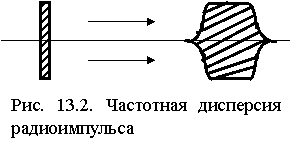 Реальный физический сигнал представляет собой совокупность бесконечного числа перемещающихся монохроматических волн, следовательно, из-за частотной дисперсии радиоимпульс по мере перемещения будет деформироваться, расплываться (рис. 13.2).