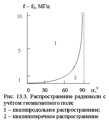 Результаты расчетов, показывающие, при каких значениях угла a между направлением радиоволны и геомагнитным полем можно рассматривать это распространение или как квазипродольное, или как квазипоперечное, представлены на рис. 13.3. Из него следует, что квазипродольное распространение справедливо в весьма широком диапазоне углов a.