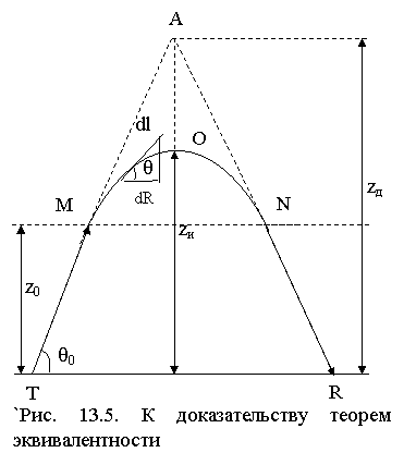 Выражение (13.27) представляет собой математическую трактовку первой теоремы эквивалентнос-ти (теорема Брайта-Тюва), которая гласит: время про-хождения сигналом искри-вленного участка траекто-рии в ионосфере с группо-вой скоростью vгр равно времени прохождения сиг-налом воображаемого треу-гольного пути MAN со ско-ростью света с.