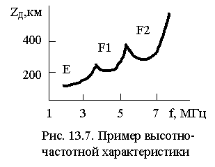 . Шкала горизонтальной развертки обычно калибруется в значениях действующей высоты zд. Изменяя несущую частоту, получают зависимость zд(f), называемую ВЧХ - высотно-частотной характеристикой. Пример ВЧХ представлен на рис. 13.7.