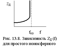 Зависимость zд от частоты f, которая должна наблюдаться при вертикальном зондировании простого ионосферного слоя, приведена на рис. 13.8.
