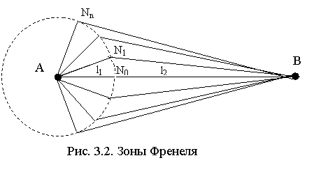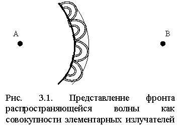 Определим область пространства, в которой распространяется основная часть радиоволны, формирующая сигнал в точке приёма. Размер и конфигурация такой области определяются принципом Гюйгенса - Френеля, согласно которому каждая точка фронта распространяющейся волны, созданной каким-то первичным источником А, сама является источником новой сферической волны (рис. 3.1).
