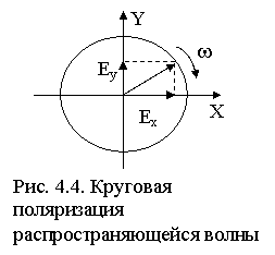 Когда вектор E при распространении волны не меняет своей ориентации в пространстве (т. е. описывает прямую по фронту волны), такую волну называют линейно поляризованной. Если вектор E распространяющейся волны, оставаясь постоянным по величине, меняет свое направление в пространстве так, что его конец описывает окружность (рис. 4.4), говорят о круговой поляризации волны. Такую волну можно представить как суперпозицию двух линейно поляризованных волн