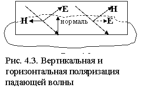 Плоскость падения - плоскость, проходящая через направление паде-ния волны и нормаль к граничной поверхности (к поверхности раздела двух сред) в точке падения. Если вектор поля E лежит в плоскости падения, то падающая волна называется волной с вертикальной поляризацией (рис.4.3). Если E перпендикулярен плоскости падения, то волна считается поляризованной горизонтально. В случае произвольной ориентации вектора E его можно разложить на вертикальную и горизонтальную составляющие EВ и EГ.