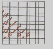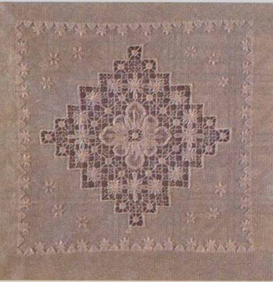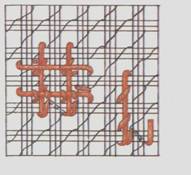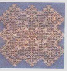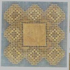 Настил Выполняя шов, иглу проводите по горизонтали или вертикали так, чтобы нитка проходила поочерёдно то над столбиком сетки, то под ним. В обратном направлении нитка покрывает столбики, которые не были покрыты, и проходит под столбиками, над которыми она проходила. Так перештопайте столбики несколько раз, пока вся клетка не будет заполнена. Настил выполняют нитками мулине в 2—4 сложения.