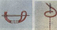 Закрепление нитки на ткани. В вышивке на рабочей нитке никогда не делают узелки. Изнаночная сторона вышитого изделия должна быть чистой и аккуратной. Нитку закрепляйте на лицевой стороне ткани в том месте, где будет расположена вышивка. Если для вышивки необходимо взять чётное число нитей, например 6 ниток мулине, от пасмы ниток отделите (по одной) 3 нитки. Сложите их вместе и вденьте в иглу двумя концами. Иглой с ниткой сделайте стежок и вытягивайте нитку из ткани до тех пор, пока останется маленький кончик в виде петли, которая образовалась при складывании нитки вдвое. В эту петлю проденьте иглу с рабочей ниткой и затяните её (рис. слева).