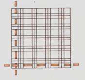 Строчевая сетка. Для выполнения строчевой сетки нужна ткань с прямым (полотняным) переплетением нитей (суровое полотно, лён с лавсаном, рогожка и т. п.). При расчёте клеток сетки надо учитывать толщину нитей ткани и вид строчевой вышивки. Так, например, для белой мелкой строчки надо выдернуть 3— 4 нити и столько же оставить. Для горьковского гипюра выдёргивают 10 и более нитей, 5—6 оставляют, а для цветной перевити оставляют нитей больше, чем выдёргивают (например, 2—3 выдёргивают, а 4—6 оставляют). Если нити ткани по утку и основе неодинаковой толщины, расчёт их по горизонтали и вертикали надо сделать разный, чтобы клеточки (дырочки) строчевой сетки были квадратные. На плотных тонких тканях расчёт нитей делают с помощью линейки или миллиметровки. Края ткани выравнивают и намечают расположение строчевой вышивки. Обычно она имеет форму квадрата или прямоугольника. Вдоль двух сторон, образующих левый нижний угол квадрата, т. е. по горизонтали и вертикали, выдерните 1—2 нити ткани. Иглу с цветной ниткой проведите по следу выдернутых нитей, то набирая, то пропуская определённое число нитей.