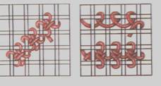 Сделав стежок на ткани, выполните третий ряд обвивки сетки в направлении снизу справа вверх — налево. Так обвейте всю сетку, продвигаясь уступами по диагонали то снизу вверх, то сверху вниз. При этом все стежки по лицевой стороне ложатся в одном направлении, располагаясь от левого нижнего угла к правому верхнему углу квадрата. На изнаночной стороне два параллельных стежка располагаются по другой диагонали под каждым пересечением горизонтальных и вертикальных нитей сетки. В зависимости от размера сетки каждый столбик обвивают 1, 2 и 3 раза, а крайние столбики на один стежок больше, т. е. если каждый столбик сетки обвивают 1 раз, то крайние столбики — по 2 раза. Это делают потому, то крайние клетки в узоре не заполняют строчевыми разделками.