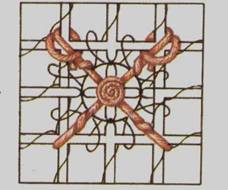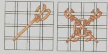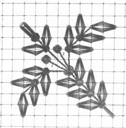 «Паутинка» или воздушнопетельный шов. Закрепив нитку на нижнем горизонтальном столбике, ведите её к левому столбику, игла проходит под столбиком слева направо, образуя первую петельку. Такую же петельку выполняйте на верхнем столбике клетки: игла проходит под столбиком сверху вниз и выходит с левой стороны проложенной нитки, образуя вторую петельку. Затем иглу проведите под правым столбиком клетки справа налево, выведите её выше проложенной нитки и направляйте к нижнему горизонтальному столбику. Нитка ложится поверх ниток от двух предыдущих петелек и уходит на изнаночную сторону с левой стороны нитки, идущей к левому столбику. В клетке сетки получается маленький ромбик. При переходе от одной клетки к другой рабочая нитка обвивает горизонтальные столбики сетки.