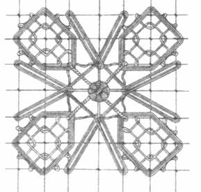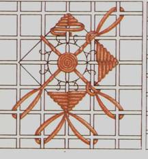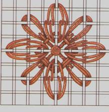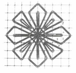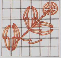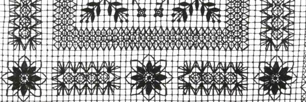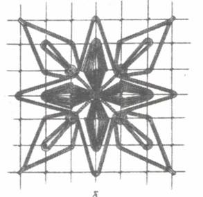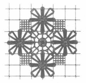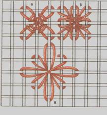 Это четырёх - и восьмилепестковые цветочки, обводка мотива по контуру. Эти узоры вышивают нитками мулине (в 2—4 сложения). Четырёхлепестковый цветочек вышивают в квадрате из четырёх клеток сетки. Закрепите нитку в центре квадрата и уложите сначала по одной диагонали, затем — по другой, как бы рисуя восьмёрку.