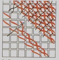Ткань с сеткой натяните на пяльцы, следя за тем, чтобы сетка не перекосилась. Сетку обшейте катушечными нитками (№№ 40, 50) в тон ткани. Нитку закрепите в левом нижнем углу сетки с левой стороны вертикального столбика. Этот столбик обвейте, подводя под него иглу с ниткой в направлении справа налево. Затем проложите нитку по диагонали под пересечением горизонтальных и вертикальных нитей сетки в виде квадратика ткани и обвейте первый горизонтальный столбик движением снизу вверх. Для того чтобы перейти ко второму горизонтальному столбику, сделайте один стежок на ткани между первым и вторым горизонтальными столбиками сетки и выведите иглу на лицевую сторону перед вторым горизонтальным столбиком. Обвейте его, а иглу с ниткой проведите по диагонали под новым квадратиком ткани. Затем обвейте вертикальный столбик, а иглу проведите по диагонали под «старым» квадратиком ткани (под которым уже проложена нитка по диагонали), обвейте горизонтальный столбик, проложите нитку под «новым» квадратиком и т. д. до конца сетки.