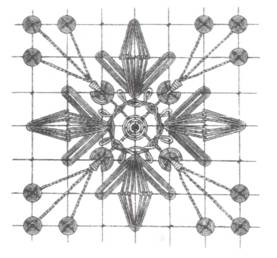 Нитку уложите по 2 и более раз в каждом направлении и уведите на изнаночную сторону в центре квадрата. Затем выполните сердцевину цветка, перештопывая лепестки его или уклаывая стежки по кругу по принципу шва «за иголку». Восьмилепестковый цветок получится, если лепестки расположить так же по вертикали и горизонтали. Эти лепестки могут быть в 2 раза длиннее. Лепестки большого цветка вышивают тройной штопкой и обводят несколько раз по контуру нитками мулине. Обводку выполняйте по принципу шва «вперёд иголку» сначала в одном направлении, затем — в обратном, по пропущенным местам.