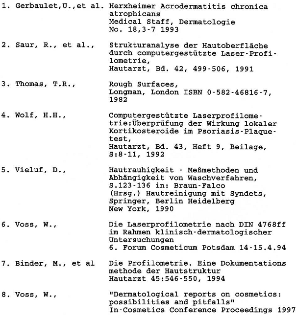 С целью более точной бесконтактной оценки шероховатости кожи специалисты клиники кожных болезней университета г. Любек совместно с фирмой UBM-Meßtechnik (г. Эттлинген) разработали метод компьютерной лазерной профилометрии, позволяющий провести количественный анализ структуры поверхности кожи. Метод позволяет провести точное измерение параметров кожи в соответствии с нормами DIN 4768ff.
