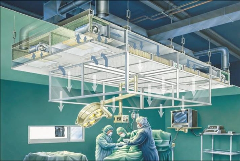в чистых помещениях класса ISO 5 (класс 100) НЕРА-фильтры устанавливаются по всей площади потолка для создания однонаправленного вертикального воздушного потока через чистое помещение.