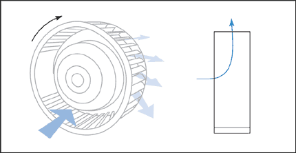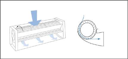 Диаметральные вентиляторыВ диаметральных вентиляторах воздух проходит напрямую вдоль рабочего колеса, и как входящий, так и исходящий потоки располагаются по периметру рабочего колеса. Несмотря на небольшой диаметр, рабочее колесо может подавать большие объемы воздуха, а потому пригодно для применения в небольших вентиляционных установках, например воздушная завеса. Уровень эффективности может достигать 65%. Прохождение воздушного потока через диаметральный вентилятор: