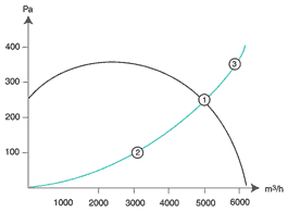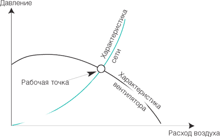 Аэродинамические характеристики вентиляторовАэродинамические характеристики вентиляторов показывают расход вентиляторов в зависимости от давления. Определенное давление соответствует определенному расходу воздуха, который проиллюстрирован кривой вентилятора. Аэродинамические характеристики вентилятора и сети: