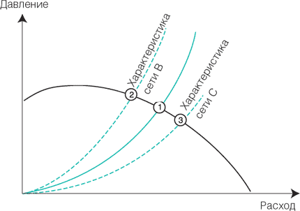 Если реальное сопротивление сети представлено кривой В, рабочая точка сдвигается с 1 на 2. Это так же влечет за собой уменьшение расхода воздуха. Таким же образом расход воздуха возрастет, если сопротивление сети соответствует линии С. Если реальный перепад давления в системе воздуховодов больше или меньше, чем расчетный, рабочая точка и расход воздуха будут отличаться от того, что ожидалось. Увеличение или уменьшение скорости вращения вентилятора: