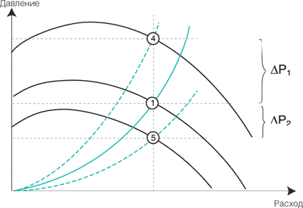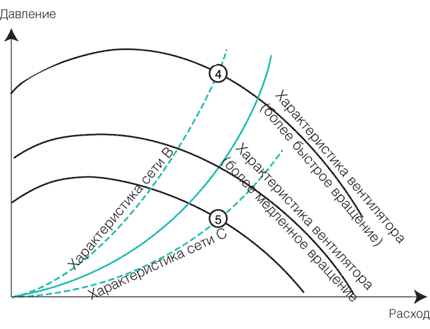 Для получения расхода воздуха, аналогичного расчетному, можно в первом случае, (где характеристика сети соответствует В), просто увеличить скорость вентилятора. Рабочая точка (4) будет находиться в этом случае на пересечении характеристики сети В и характеристики вентилятора для более высокой скорости вращения. Точно также скорость вращения вентилятора может быть уменьшена, если реальная характеристика сети соответствует линии С. Разница в давлении при различных скоростях вращения: