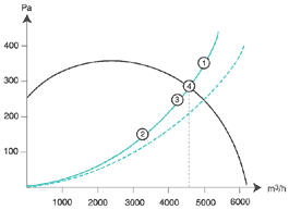 Новая рабочая точка (4) расположена на пересечении характеристики вентилятора и новой линией системы. Данный график также показывает, что увеличение давления вызывает также уменьшение расхода воздуха примерно до 4500 м3/час. | |||||||||