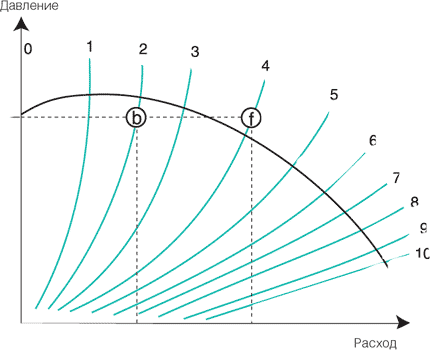 Эффективность и характеристики сетиДля того чтобы облегчить выбор вентилятора, можно построить несколько возможных характеристик сети на графике вентиляторов, а затем посмотреть, между какими характеристиками работает определенный тип вентилятора. Если пронумеровать характеристики сети от 0 до 10, вентилятор будет свободно дуть (максимальный расход воздуха) на линии 10, и захлебнется (нулевой расход) на линии 0. Это означает, что вентилятор на линии системы 4 производит 40% от свободного расхода. Характеристики сети (0:10) на графике вентилятора: