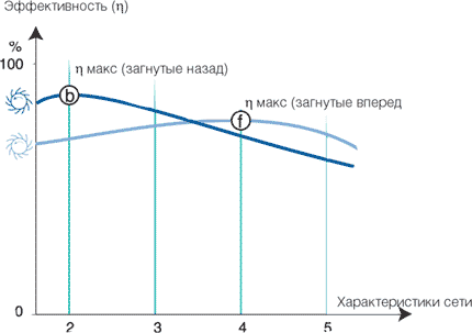 Эффективность вентилятора вдоль всей характеристики сети остается постоянной. Вентиляторы с загнутыми назад лопатками часто имеют более высокую эффективность, чем вентиляторы с загнутыми вперед лопатками. Но более высокий уровень эффективности этих вентиляторов достижим лишь на ограниченном участке, где характеристика сети представлена меньшим расходом при заданном давлении, чем у вентиляторов с загнутыми вперед лопатками. Чтобы получить расход аналогичный тому, что у вентиляторов с загнутыми вперед лопатками, и сохранить при этом высокий уровень эффективности, нужно выбрать вентилятор с загнутыми назад лопатками большего размера. Значения эффективности для аналогичных размеров центробежных вентиляторов с лопатками, загнутыми назад и загнутыми вперед, соответственно: