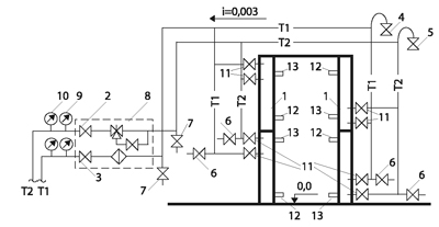 4) Заполнить систему водой, открыв кран 3 (кран 2 закрыт), все краны 11,5 и кран 7 на магистрали Т2. После прекращения выхода воздуха через краны 7 и 5 их следует закрыть.