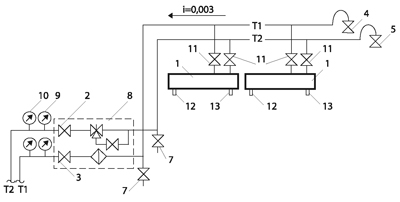 На рисунке вертикальная двусторонняя завеса 1 из четырех секций подключена к отопительной сети через смесительный узел 8.