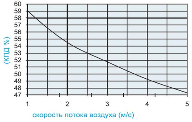 Эффективность пластинчатых рекуператоров в зависимости от скорости потока воздуха одной типовой секции:
