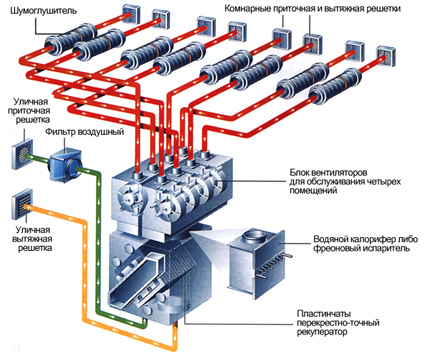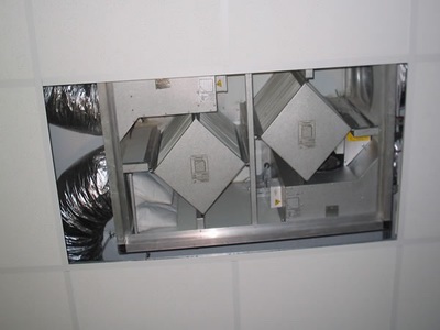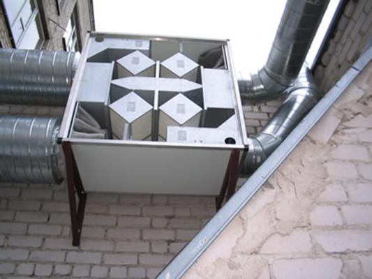 Смонтированный и обвязанный воздуховодами пластинчатый рекуператор. Односекционные рекуператоры часто используются в промышленных приточно-вытяжных установках. Приточно-вытяжная установка на базе пластинчатого перекрестного рекуператора для нескольких помещений: