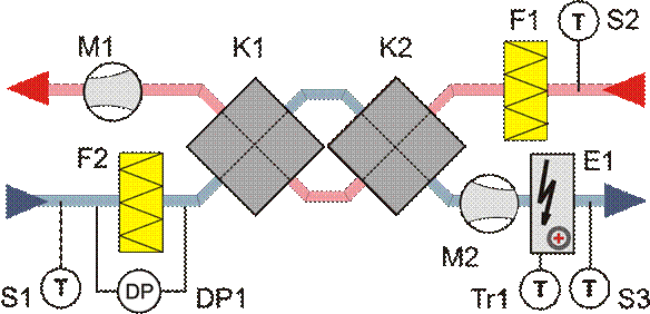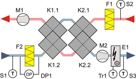 Описание условных обозначений: M1 – Вытяжной вентилятор; M2 – Приточный вентилятор; S1 – Датчик температуры уличного воздуха; S2 – Датчик температуры вытяжного воздуха*; S3 – Датчик температуры приточного воздуха; DP1 – Датчик загрязнённости фильтра; TR1 – Защитный термостат эл. нагревателя; E1 – Электрический нагреватель; F1 – Воздушный фильтр вытяжного воздуха; F2 – Воздушный фильтр приточного воздуха; K1.1, К2.1, K1.2, К2.2 – Теплообменные кассеты.