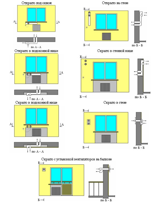 Монтироваться рекуператор может прямо на стене, или в специально предусмотренных нишах в стене (в этом случае есть вариант расположения корпуса рекуператора перпендикулярно плоскости стены), или в виде отдельного элемента интерьера помещения (например, будучи декоративно оформлен в виде полуколонны) и пр. При этом обеспечивается энергосбережение, комфортный тепловой режим и предусмотренные санитарными нормами уровни воздухообмена.