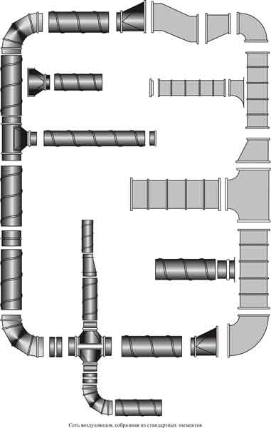 Сеть воздуховодов необходимо компоновать из унифицированных деталей: прямых участков, переходов, отводов, тройников, крестовин и заглушек.