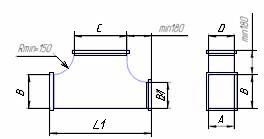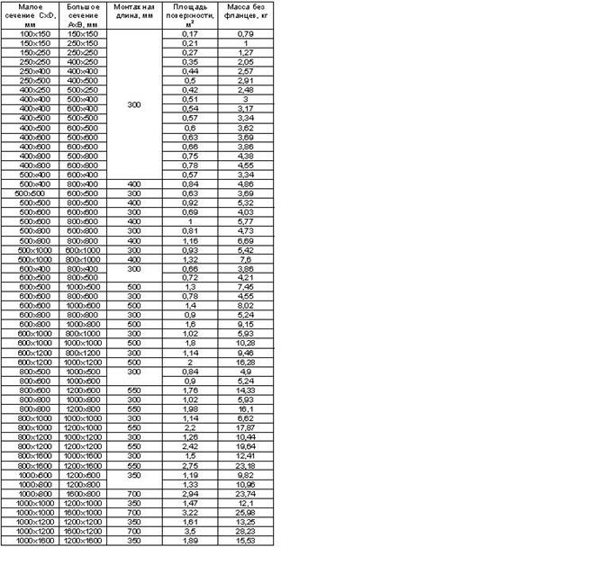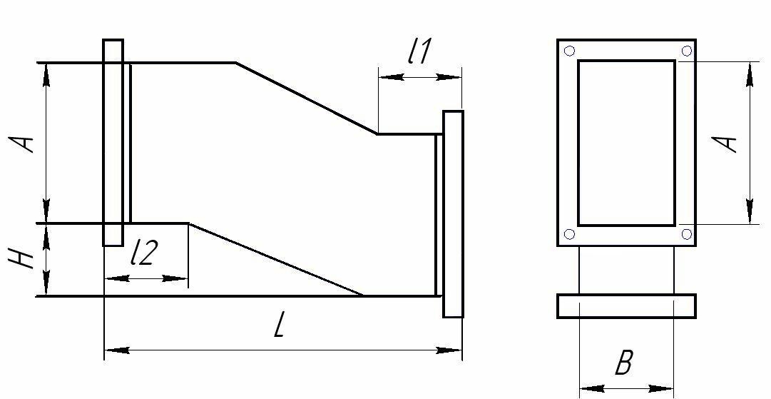 Предназначен для соединения частей систем, состоящих из воздуховодов прямоугольного сечения, при переменном сечении системы. Со стороны прямоугольного сечения соединение фланец или под рейку.