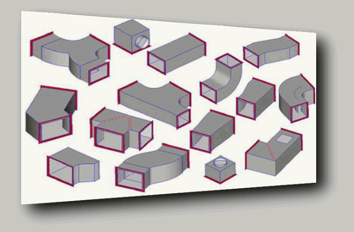 Состоят из типовых элементов круглого или прямоугольного сечения. Элементы состоят из прямых участков и фассонных элементов (отводы, переходы, тройники, крестовины, зонты, адаптеры, боксы). Фассанина стоит значительно дороже прямиков если сравнивать стоимость изделия за м2. Возможно изготовить любой воздуховод в пределах возможного, например овальный или треугольный. Нетиповые элементы стоят дороже, т. к. под них необходимо рассчитывать и создавать индивидуальные выкройки.