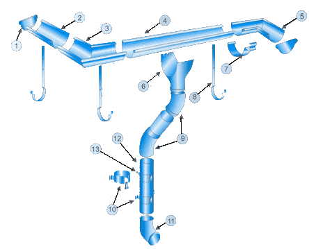 1. Заглушка желоба 2. Желоб водосточный 3. Угол желоба наружный 4. Желоб водосточный 5. Угол желоба внутренний 6. Воронка выпускная 7. Соединитель желобов 8. Держатель желоба 9. Колено трубы 10.Держатель трубы с лапками 11.Колено сливное 12.Труба водосточная 13.Держатель трубы штырь
