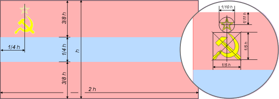 В "Положении о Государственном флаге Армянской Советской Социалистической Республики", утвержденном Указом Президиума Верховного Совета Армянской ССР от 01.01.01 года было уточнено, что «серп и молот вписываются в квадрат, сторона которого равна 1/5 ширины флага. Острый конец серпа приходится посередине верхней стороны квадрата, рукоятки сера и молота упираются в нижние углы квадрата. Длина молота с рукояткой составляет 3/4 диагонали квадрата. Пятиконечная звезда вписывается в окружность диаметром в 1/10 ширины флага, касающуюся середины верхней стороны квадрата. Расстояние вертикальной оси звезды, серпа и молота от древка равняется 1/4 ширины флага. Расстояние от верхней кромки флага до центра звезды – 1/11 ширины флага". Данное описание осталось без изменений в новой редакции Положения о Государственном флаге Армянской ССР, утвержденной Указом Президиума Верховного Совета Армянской ССР от 01.01.01 года, В новой Конституции (Основном законе) Армянской ССР, принятой 14 апреля 1978 года внеочередной седьмой сессией Верховного Совета Армянской ССР, флаг был описан следующим образом: «Статья 167. Государственный флаг Армянской Советской Социалистической Республики представляет собой красное прямоугольное полотнище с синей полосой посредине во всю длину флага. На верхней красной части полотнища флага, у древка, изображены золотые серп и молот, а над ними красная пятиконечная звезда, обрамленная золотой каймой. Отношение ширины флага к его длине – 1:2». В утвержденной Указом Президиума Верховного Совета Армянской ССР от 01.01.01 года новой редакции Положения о Государственном флаге Армянской ССР было внесено данное описание из Конституции (Основного закона) Армянской ССР и оставлены без изменений уточнения в расположении и размерах звезды, серпа и молота, содержавшихся в положениях о флаге 1955 и 1967 годов. |
