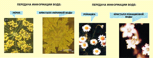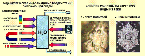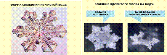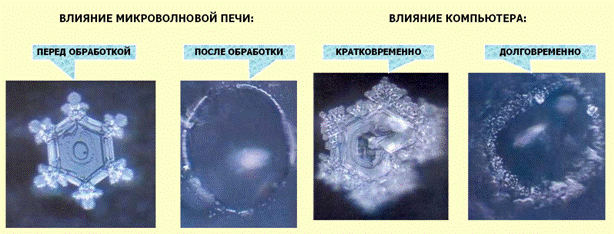 Когда наливаете воду в стакан и готовите пищу, не забывайте какие параметры оговорены в стандартах, а какие благоприятны для жизни, а также учитывайте - как окружающая среда влияет на нее (см. рис.). Косвенное свидетельство об изменении структуры воды видно по форме снежинок из тех образцов воды, которые подверглись воздействию.