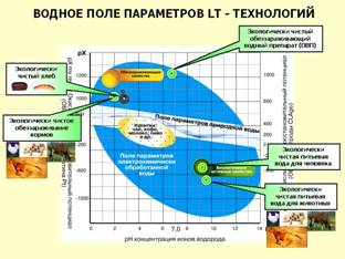 Если в современных технологиях на водных растворах применяемая вода, находящийся в термодинамическом равновесии с окружающей средой, рассматривается как статический ингредиент, то в метатехнологии вода и водные растворы рассматриваются как энергетические машины в динамике технологического процесса и ей придают другие различные параметры (помимо температуры): параметр рН (кислотности или щелочности – от 0 до 14); параметр рХ или окислительно-восстановительный потенциал (от -1200 мВ до +1200 мВ); поверхностное натяжение и др. Вода - это динамическая и энергонесущая структура, в которую можно накачивать энергию и придавать ей такие свойства, которые необходимы для решения конкретной технологической задачи: дезинфекции, экстракции, смачиваемости поверхностей, капиллярной проницаемости и т. д. и т. п. и по всему "шахматному" полю LT - параметров воды рН и рХ, которые можно контролировать типовыми приборами контроля параметров водной среды. Электро-химическое управление параметрами водных растворов на основе природной воды придает растворам оптимальные параметрами для решения технологических задач на всех переходах технологии, которое легко контролировать измерительными приборами с селективными электродами.