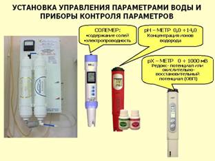 Параметры питьевой воды по нормативам ВОЗ и СанПиНа, основные из которых: кислотность воды рН 6 ÷9 (6,5 ÷ 8,5); запах, цветность, мутность, растворенный О2, железо Fe2, Fe3; жесткость общая, фенольный индекс, поверхностно активные вещества (ПАВ) (анионные, катионные, неионогенные); нефтепродукты, сульфиды и H2S; хлор, фосфаты, нитраты др.; микробиологические (ОМЧ < 50), паразитологические, металлы, минерализация (< 1000 мг/л) и др. Да еще на воду влияют природные электромагнитные поля, электромагнитный смог среды от подстанций и высоковольтных линий, кабелей, передатчиков радиостанций; звуковой фон, шум транспорта и мысли окружающих и др.