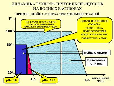 Применение целенаправленного управления параметрами водных растворов по рН и рХ на различных технологических переходах в красильно - отделочном производстве текстильной и трикотажной промышленностей на шерстяных, льняных, хлопчатобумажных, шелковых и смесовых тканях позволит получить перечисленные преимущества и, в первую очередь, сокращение технологического цикла в 3 раза. Смотри график.