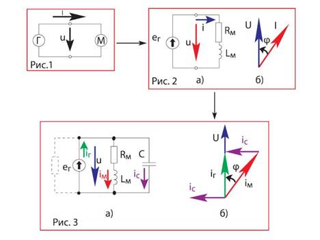 Ситуация меняется с подключением к двигателю параллельно конденсатора С, как показано на схеме 3, так как дополнительно к контуру тока между генератором и мотором добавляется контур тока между мотором и конденсатором. Подключение C-элемента никак не сказывается на работе двигателя, так как напряжение на двигателе не изменилось и, следовательно, остались неизменными его активный ток, активная мощность. Однако условия работы генератора в схеме 3 существенно отличаются от схемы 2, так как полный ток генератора iГ уже не равен току двигателя iМ, а определяется из соотношения iГ = iМ + iС, где iС — реактивный (мнимый) ток емкостного элемента, что прекрасно видно на векторных диаграммах обеих схем. При соответствующем подборе емкости конденсатора в схеме 3 можно добиться благоприятного резонансного режима, т. е. обеспечить работу генератора при максимальном значении коэффициента мощности; при этом двигатель будет обмениваться энергией, запасаемой в его магнитном поле, не с генератором, а с емкостным элементом.
